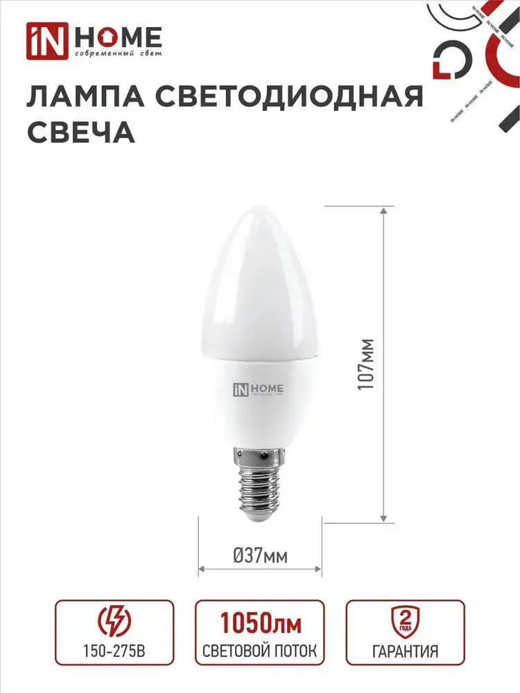 Лампочка светодиодная Е14 свеча 11Вт холодный свет 6500К 1050Лм упаковка 4шт. IN HOME