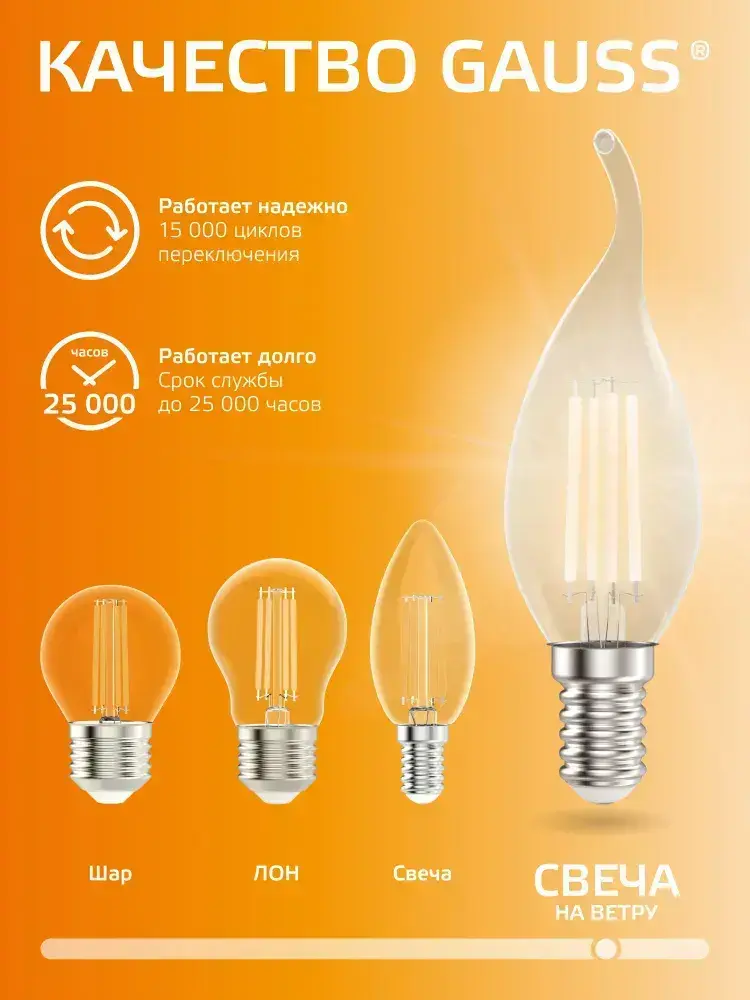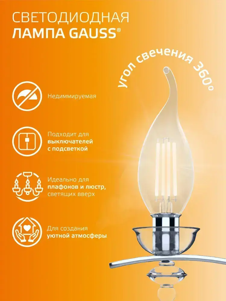 Лампочка светодиодная Е14 Свеча на ветру 5,5W Комплект 3 шт. теплый свет 2700К Gauss Filament