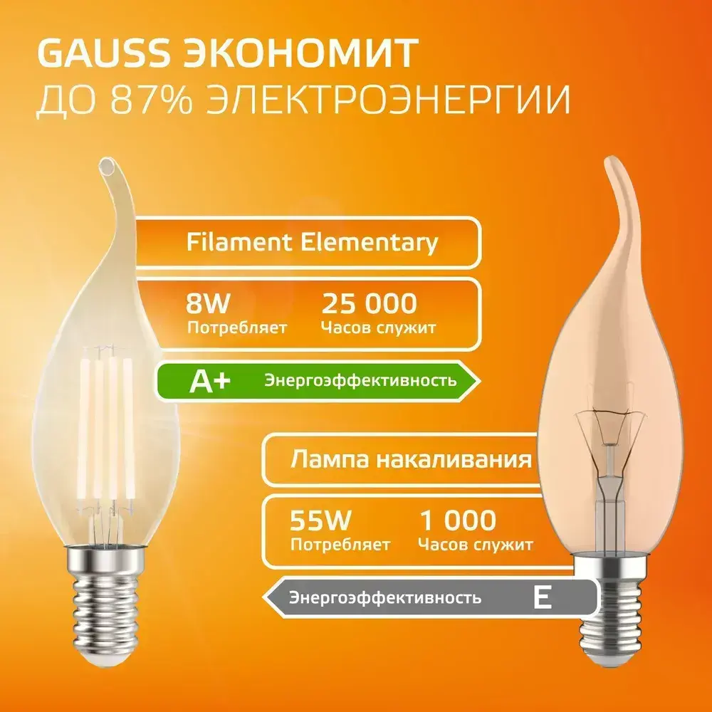 Лампочка светодиодная E14 Свеча на ветру 8W теплый свет 2700К УПАКОВКА 10 шт. Gauss Elementary Filament