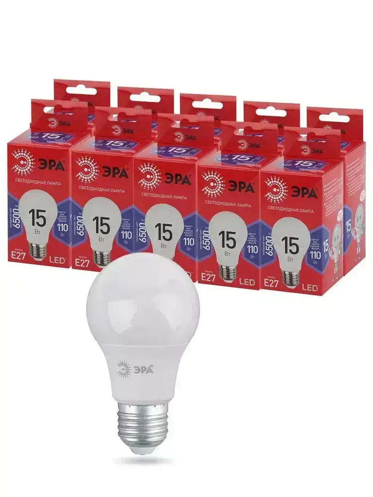 Лампочка светодиодная ЭРА LED E27 15 Вт A60 груша 6500К холодный белый свет набор 10 штук