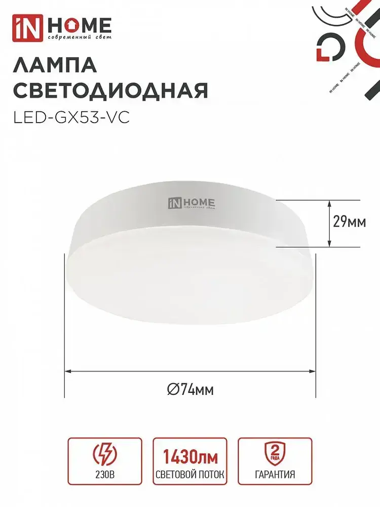 Лампочка светодиодная GX53 15W нейтральный белый 4000K 1430Лм упаковка 10 шт. IN HOME