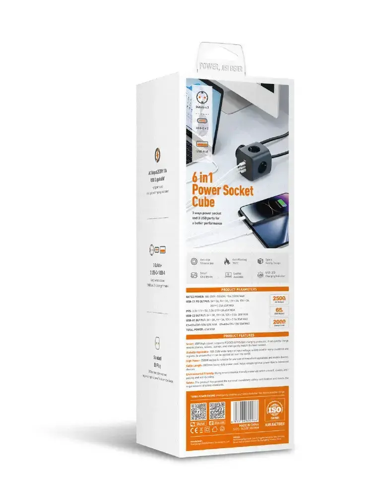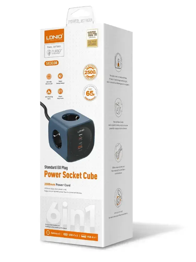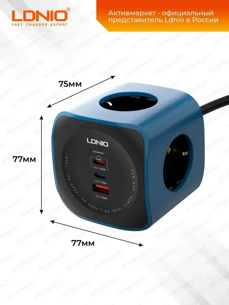 LDNIO SE3338 Удлинитель сетевой фильтр 3 розетки, супер быстрая зарядка 65 Вт, тройник разветвитель с заземлением и выключателем