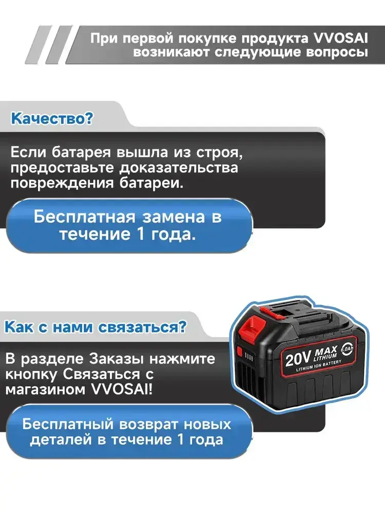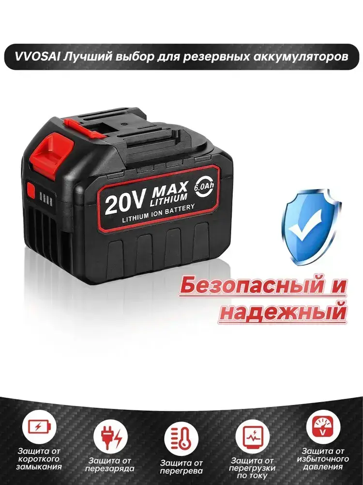 Литий-ионный аккумулятор, VVOSAI, MT-20V-60AH-10C, 20В, 6Ач, Li-Ion