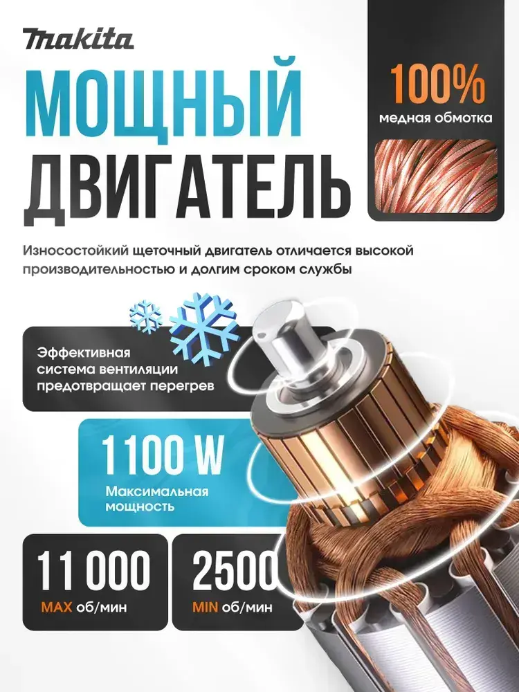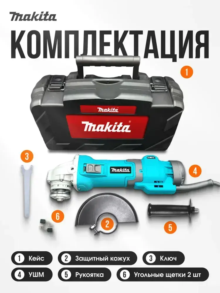 Makita Шлифовальная машинка/ болгарка 125 с регулировкой оборотов/ УШМ 1100W (1100 Вт, 125 мм) сетевая щеточная в кейсе