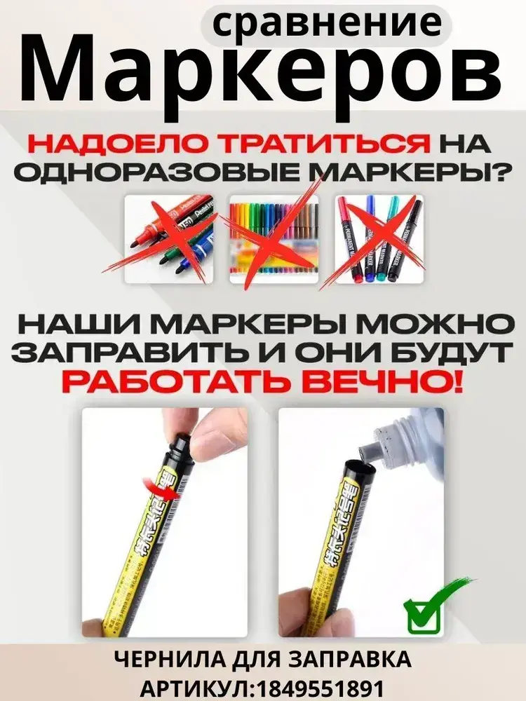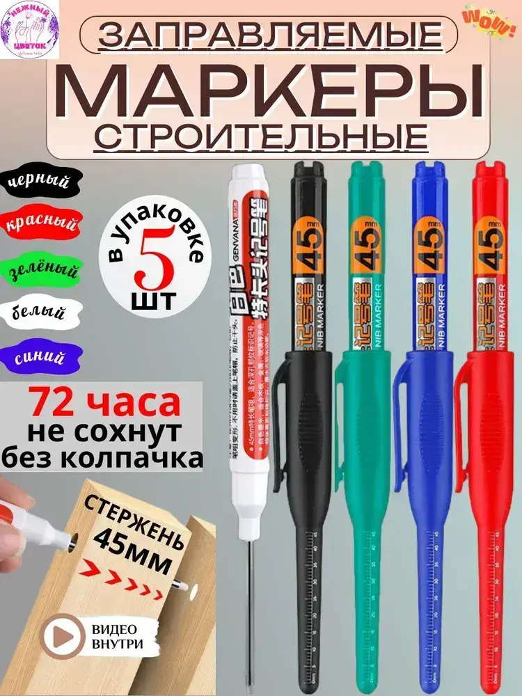 Маркер строительный, разметочный, заправляемый с длинным наконечником 45мм 5 шт-5цвет