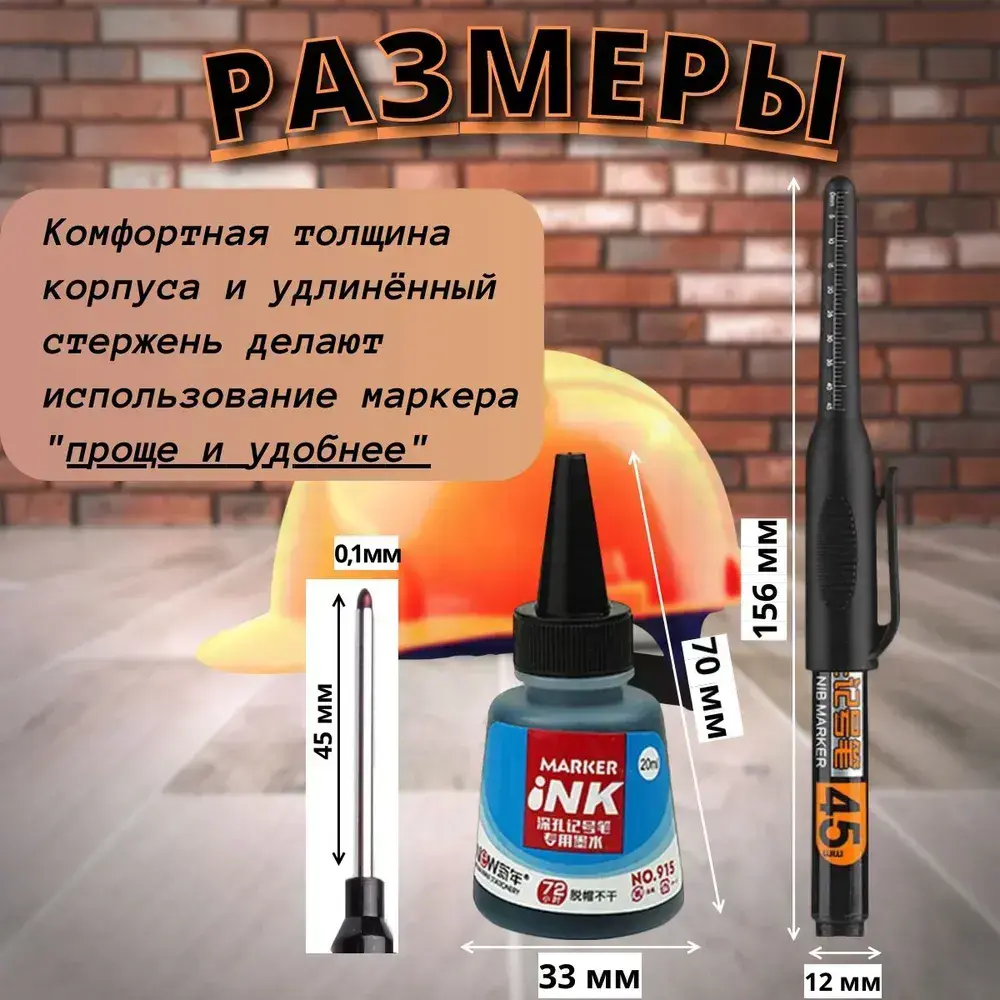 Маркер строительный с длинным наконечником 45мм, заправляемый и чернила 20мл, черный
