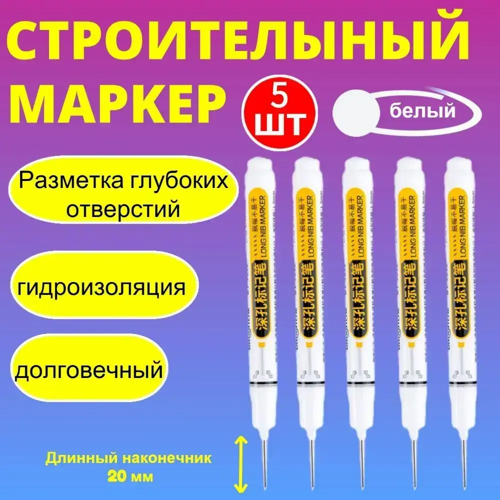 Маркер строительный тонкий разметочный с длинным наконечником / 5 шт (белый) / Маркеры строительные набор для разметки по металлу, дереву, стеклу