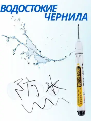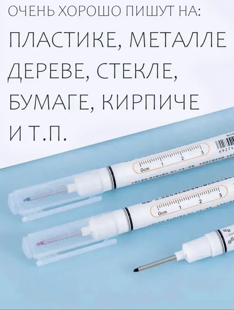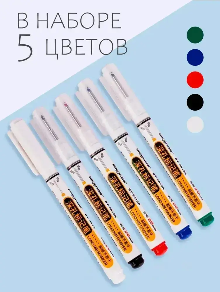Маркер строительный тонкий разметочный с длинным наконечником / 6 шт (черный, красный, зеленый, синий, 2 белых) / Маркеры строительные для разметки по металлу, дереву, стеклу, ткани