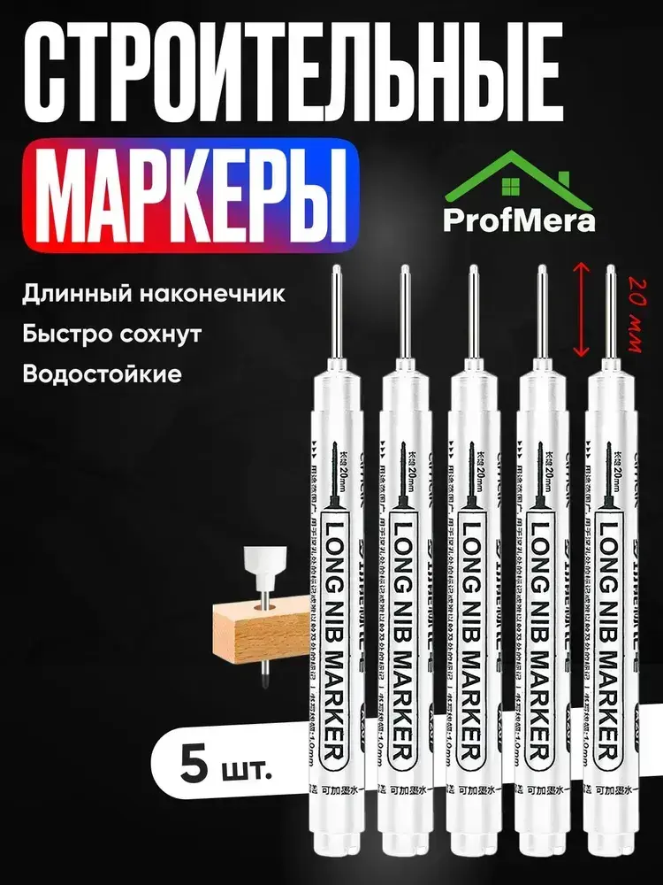 Маркер строительный тонкий разметочный с длинным наконечником, многоразовый / 5 шт. белый / Маркеры строительные набор для разметки по металлу, дереву и стеклу