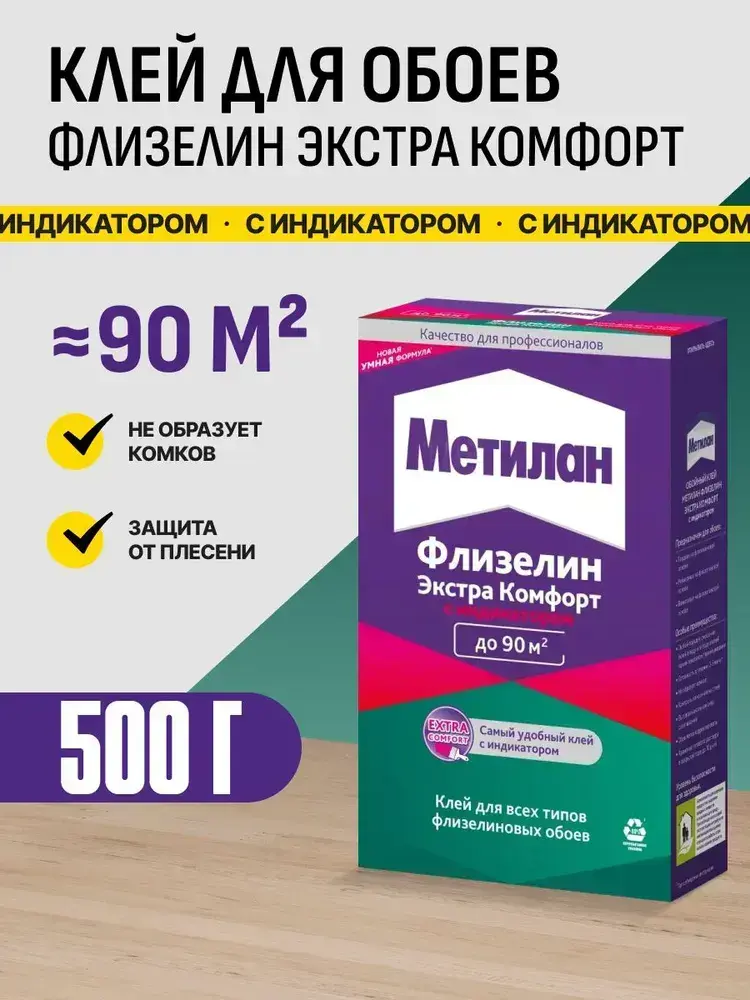 Метилан клей для обоев на флизелиновой основе / Metylan Флизелин Экстра Комфорт с индикатором 500 г