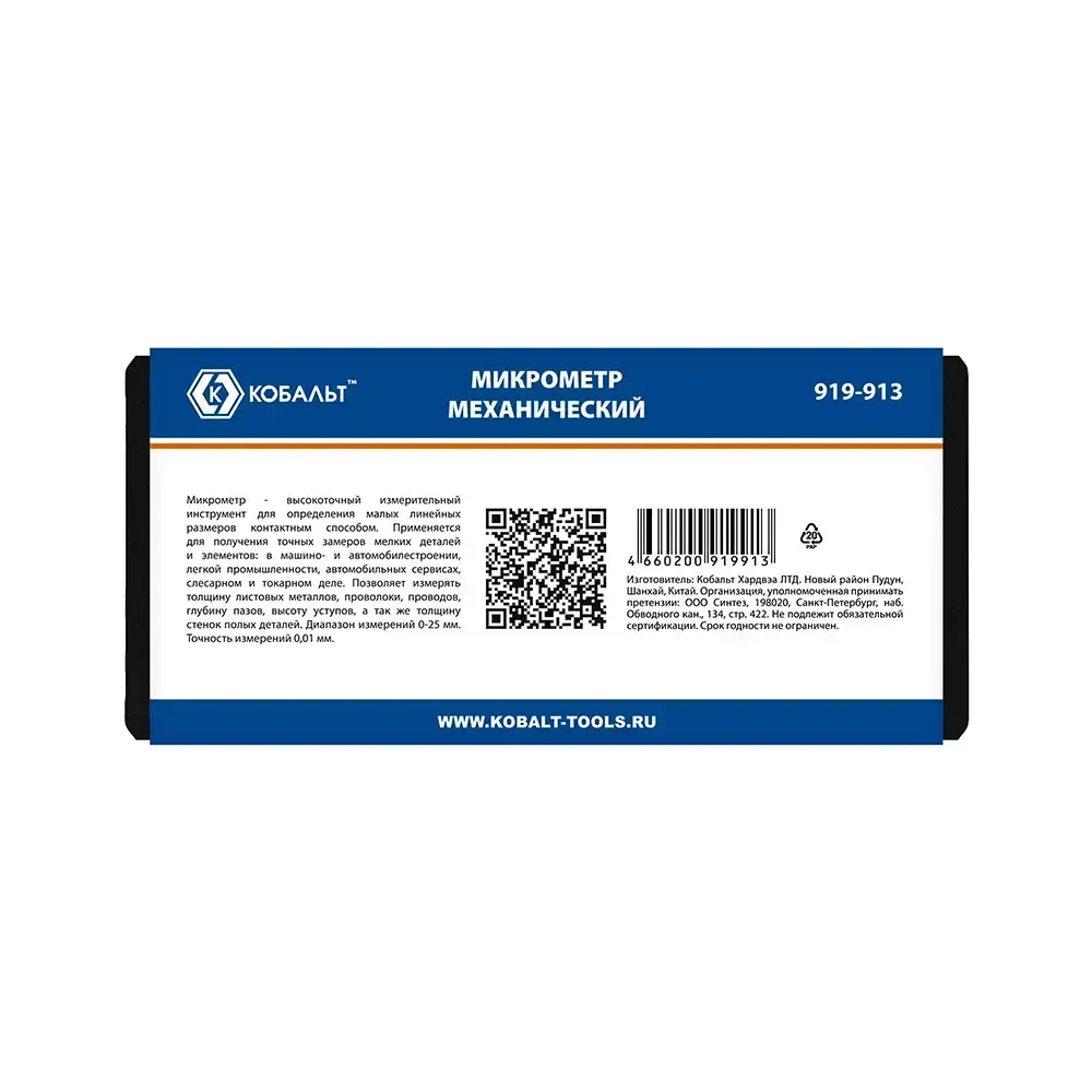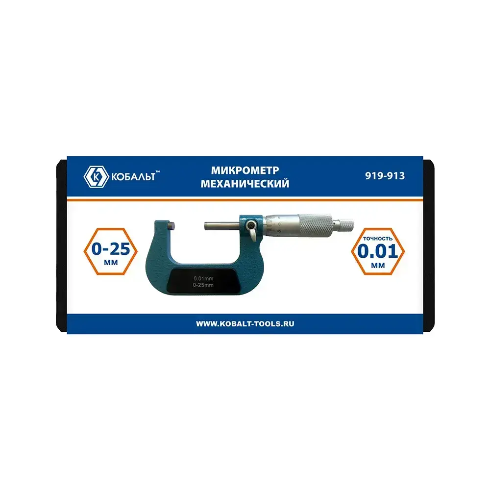 Микрометр КОБАЛЬТ механический, диапазон измерений 0-25 мм, точность 0,01 мм, кейс (919-913), шт