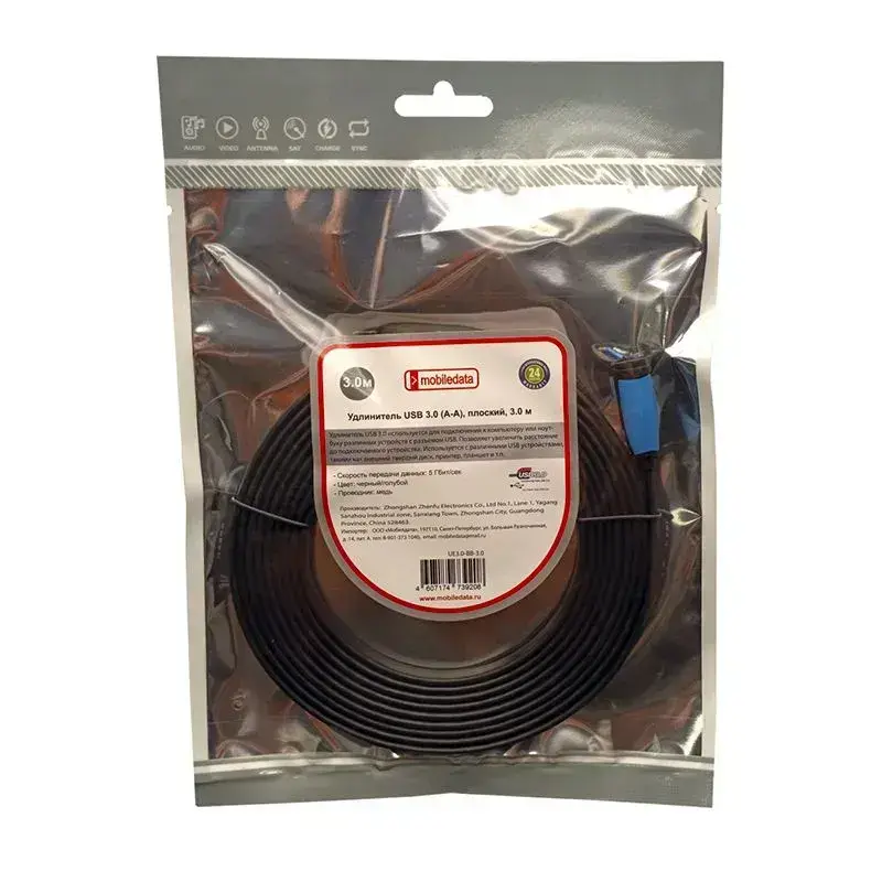 Mobiledata Удлинитель USB 3.0 (A-A), плоский, 3.0 м, черный/голубой