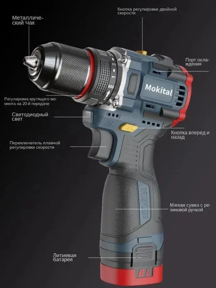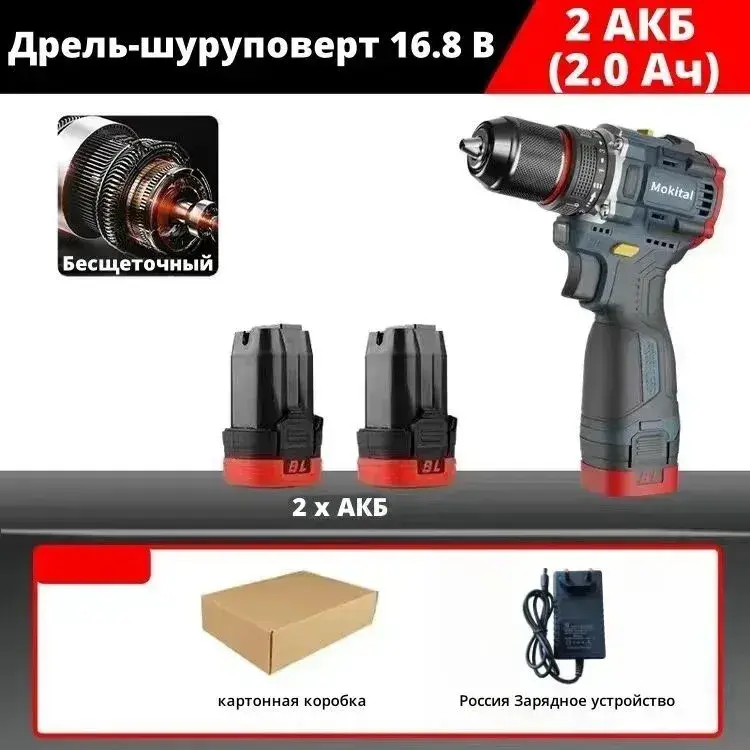 Mokital Дрель-шуруповерт, 16.8 В, 60 Нм, 2 АКБ