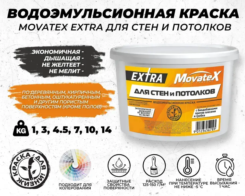 Movatex Краска водоэмульсионная EXTRA для стен и потолков 7 кг Т11872