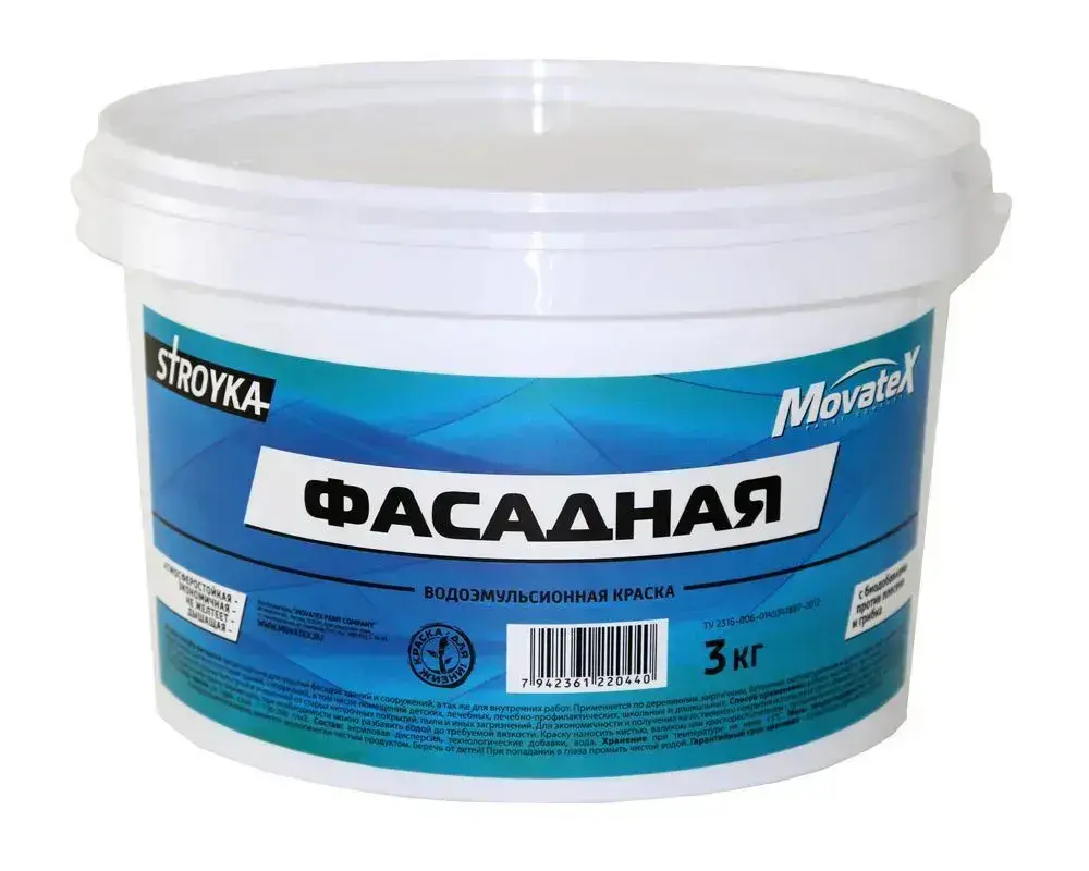 Movatex Краска водоэмульсионная Stroyka фасадная 3 кг Т31723