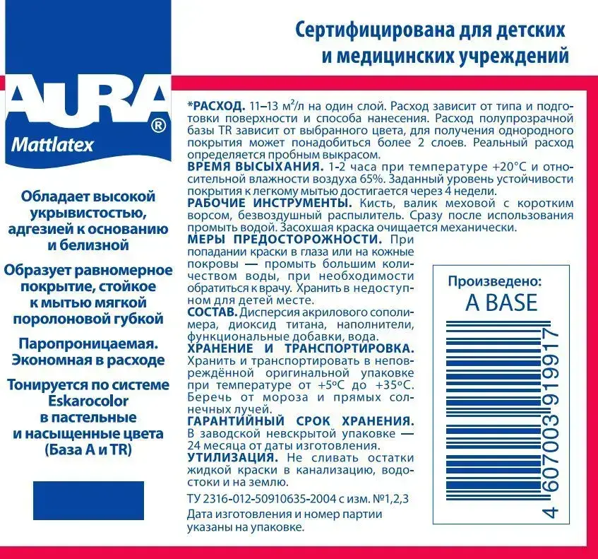 Моющаяся краска для стен и потолков акриловая белая AURA Mattlatex 4.5 л / для помещений с нормальной и повышенной влажностью