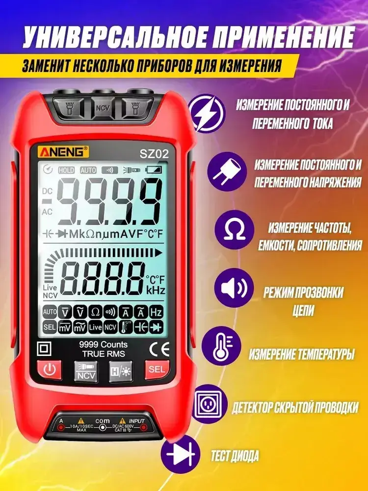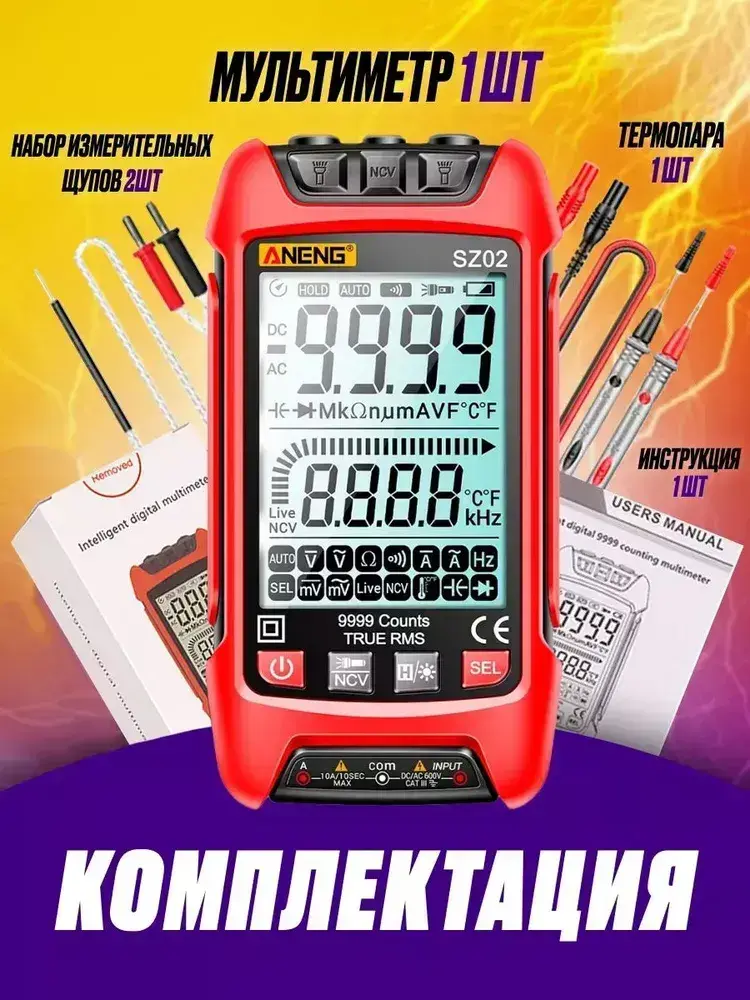 Мультиметр тестер цифровой автоматический с щупами и термопарой умный Aneng SZ02 (щуп и термопара в комплекте)
