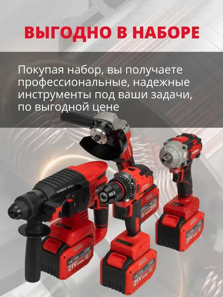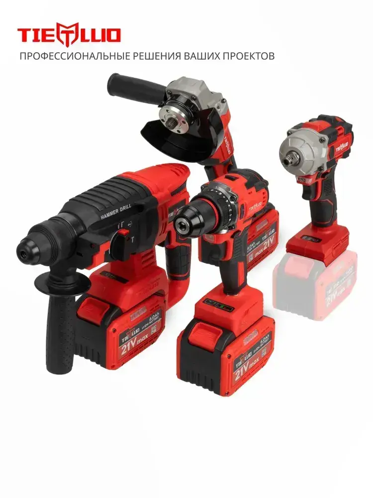 Набор 4в1 аккумуляторного инструмента TIELLIO: Перфоратор, УШМ, шуруповерт, гайковерт 3 АКБ LI-ION 6Ач