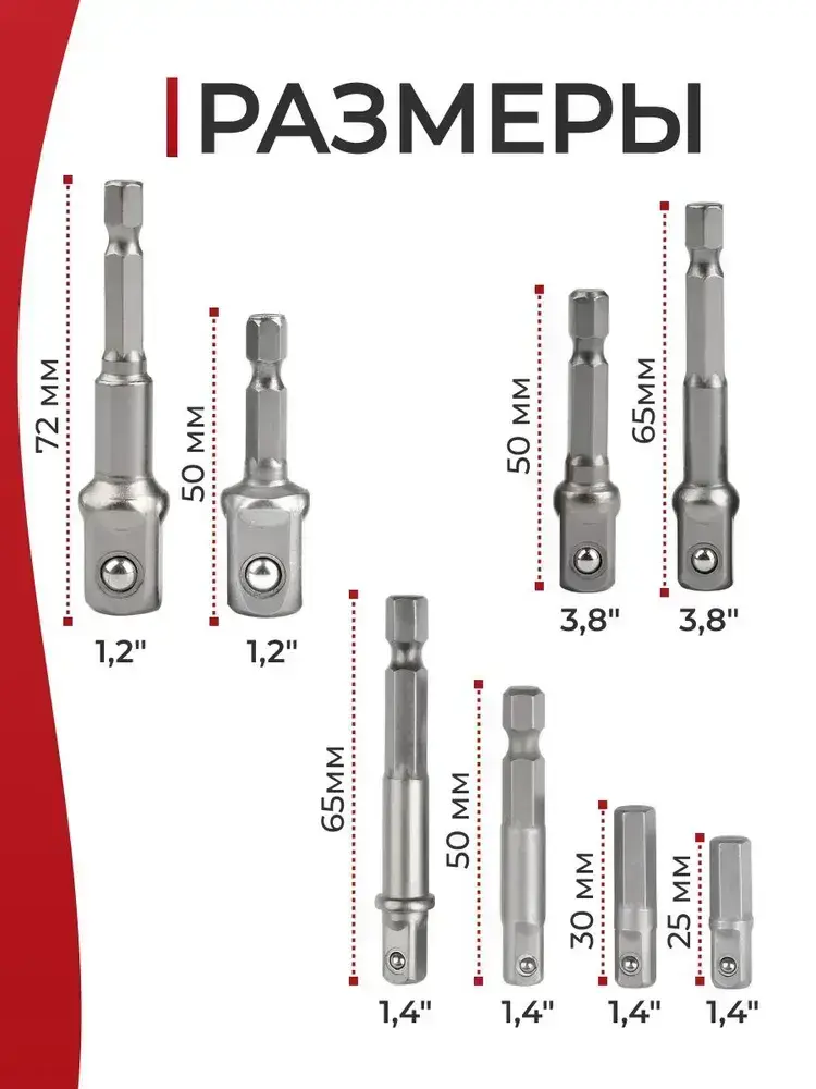 Набор адаптеров для торцевых головок / Переходники для шуруповерта под торцевые головки 1/4", 3/8", 1/2" набор 8 шт.