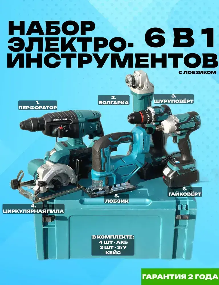 Набор аккумуляторных инструментов 6 в 1 с лобзиком, УШМ, гайковёрт, циркулярная пила, перфоратор, шуруповёрт Набор электро-инструментов