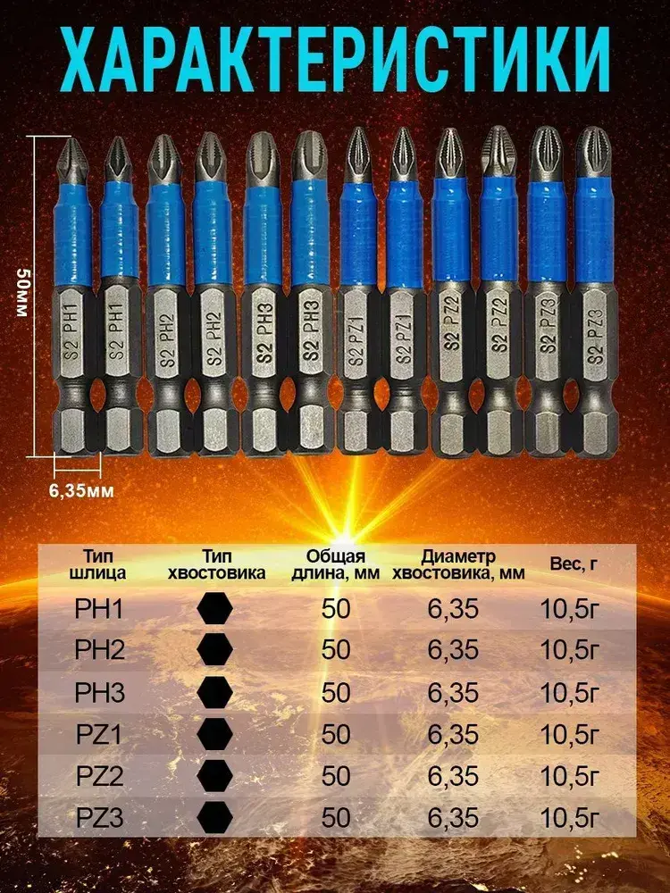 Набор бит для шуруповерта 50мм PH - PZ 12шт AIDELIFE