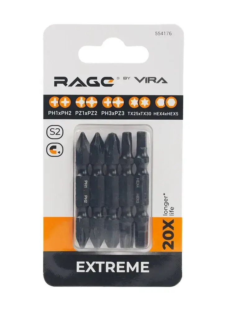 Набор бит двухсторонних 5 шт S2 PH1 x PH2 PZ1 x PZ2 PH3хPZ3 Tx25 x Tx30 Hex4 x Hex5 50 мм RAGE by VIRA