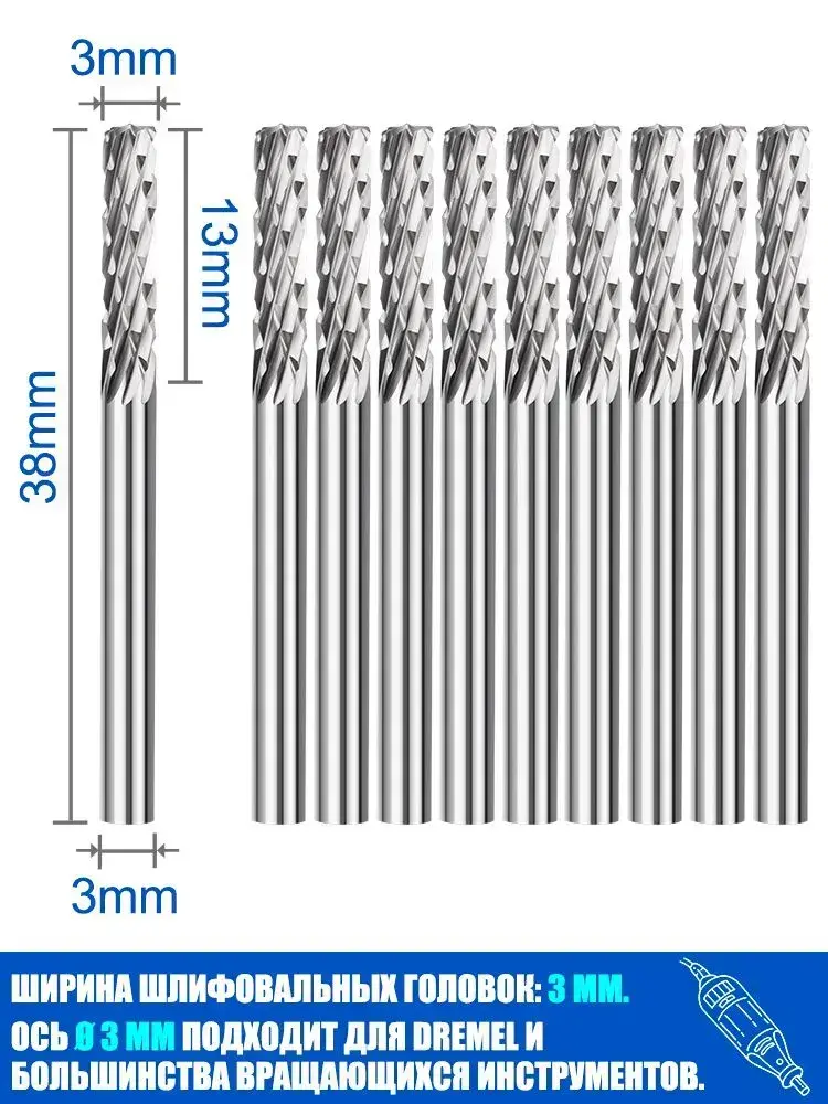 Набор борфрез твердосплавных хвостовик 3мм, форма А, двойная заточка, 38х3мм, 10шт.