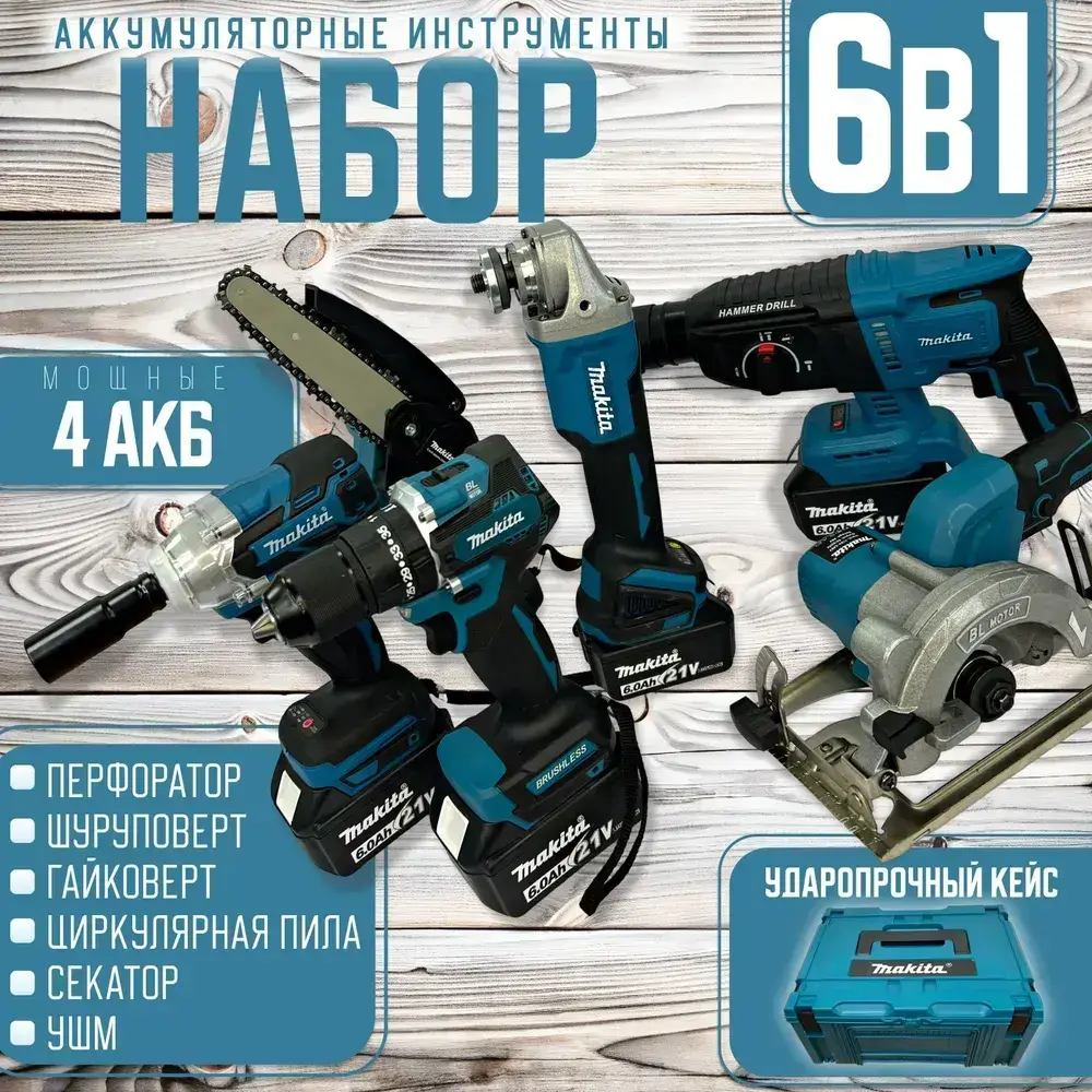 Набор инструментов аккумуляторный 6в1 (гайковерт, перфоратор, УШМ, шуруповерт, мини пила, циркулярная пила)