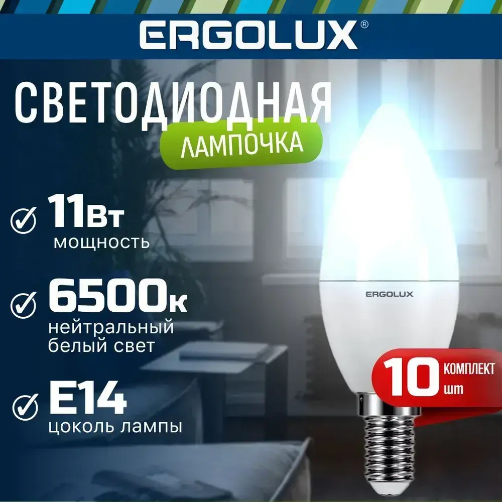 Набор из 10 светодиодных лампочек E14 6500K / Ergolux / Свеча LED, 11Вт