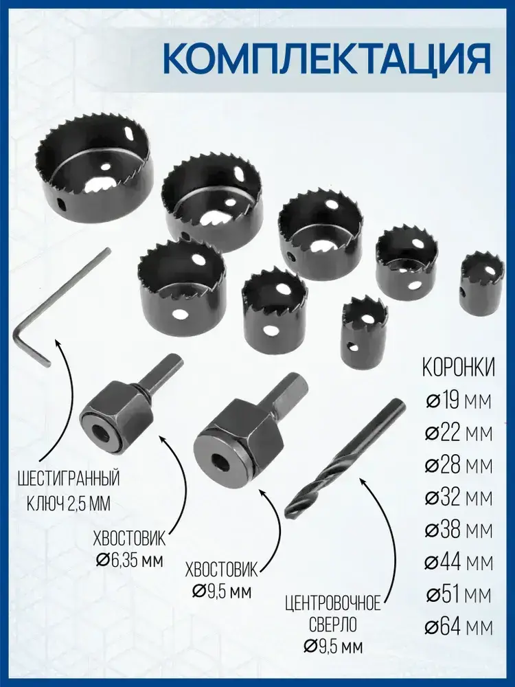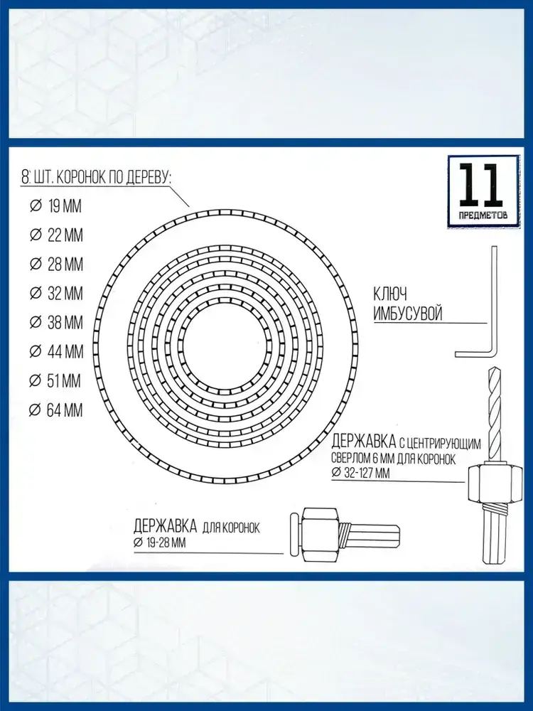 Набор коронок по дереву, 11 предметов, 19-64мм, Xpert