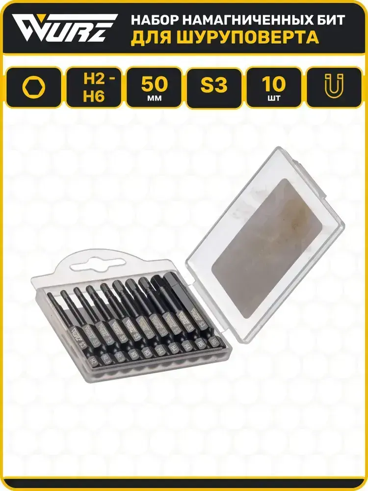 Набор намагниченных бит HEX (H2-H6) 50мм 10 предметов WURZ 4241