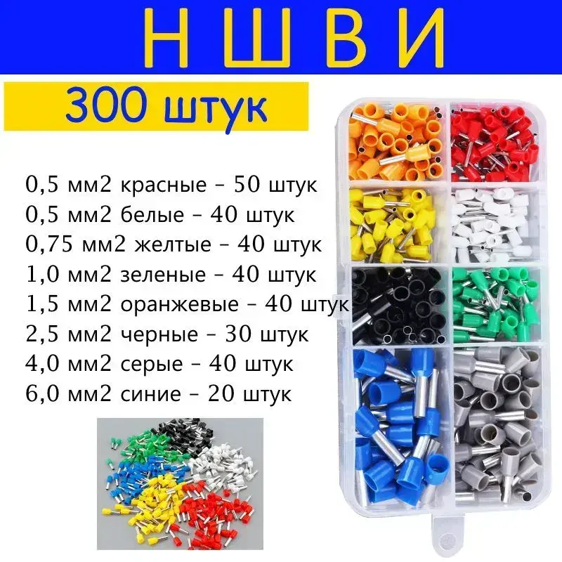 Набор НШВИ 300 шт - наконечники кабельные штыревые втулочные изолирующие для холодного обжима (опрессовки) электрических проводов