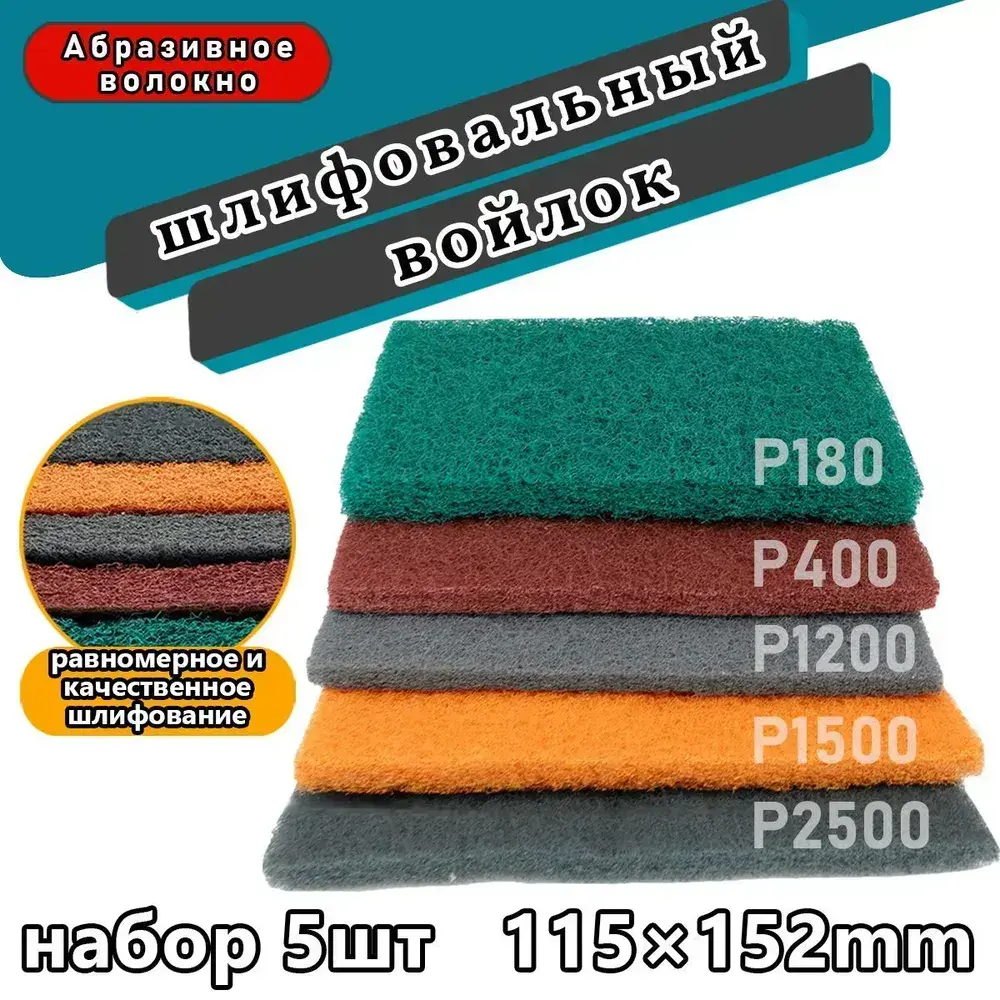 Набор шлифовальный войлок 5шт, P180, P400, P1200, P1500, P2500,115x180мм.,Набор листов нетканых шлифовальных