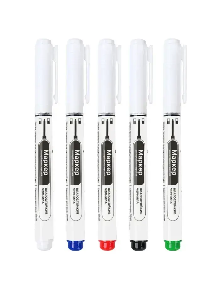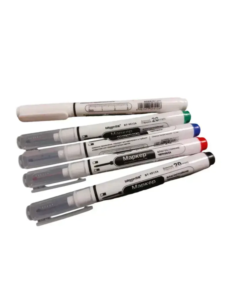 Набор тонких строительных маркеров с удлиненным наконечником (5 цветов: черный, красный, зеленый, синий, белый) для точной разметки по металлу, дереву, стеклу и ткани