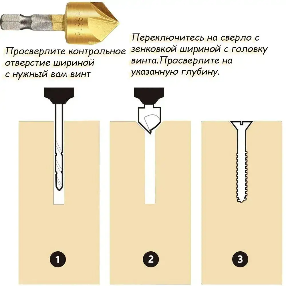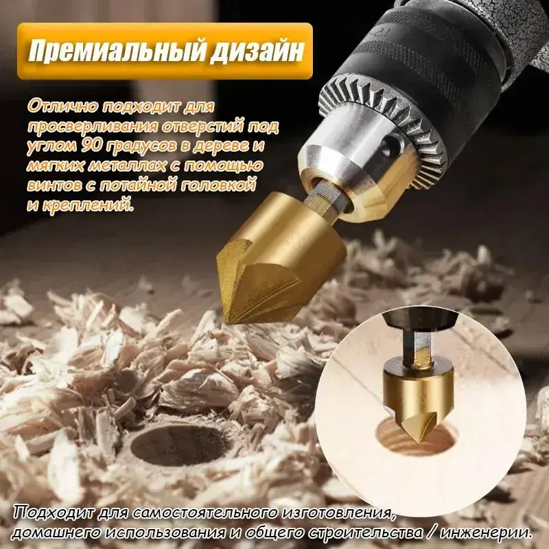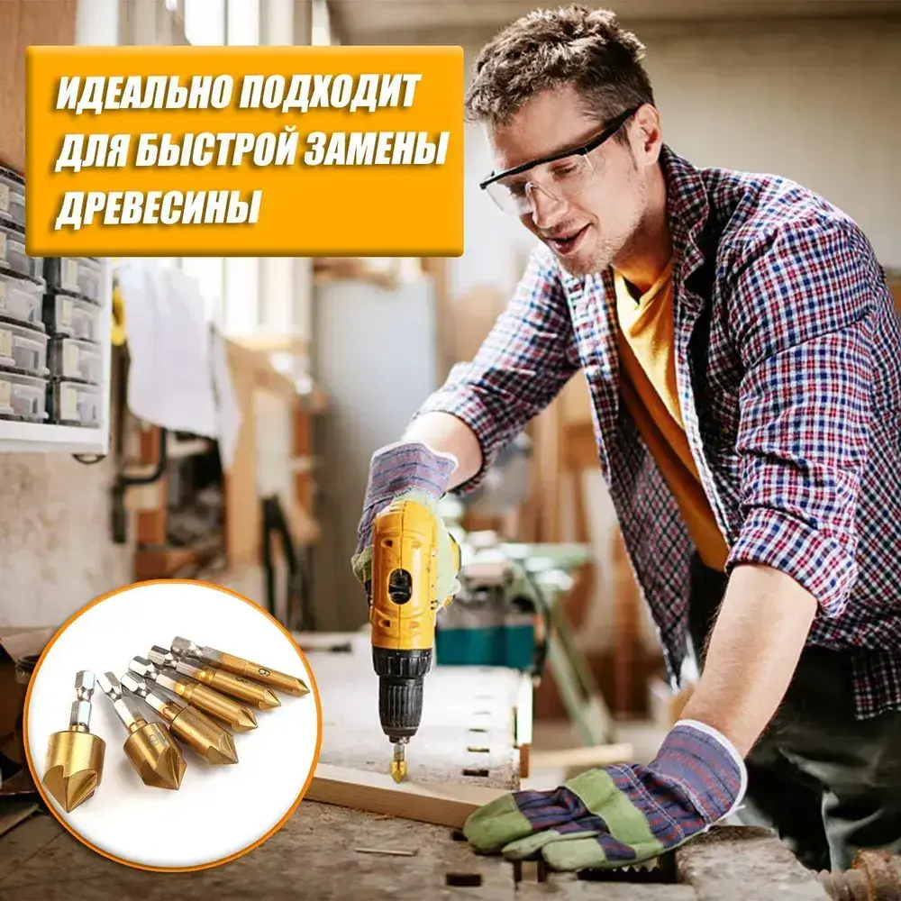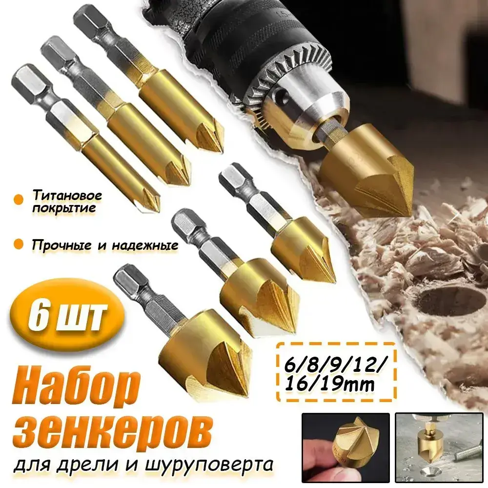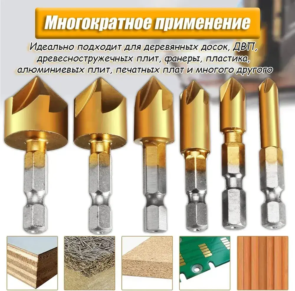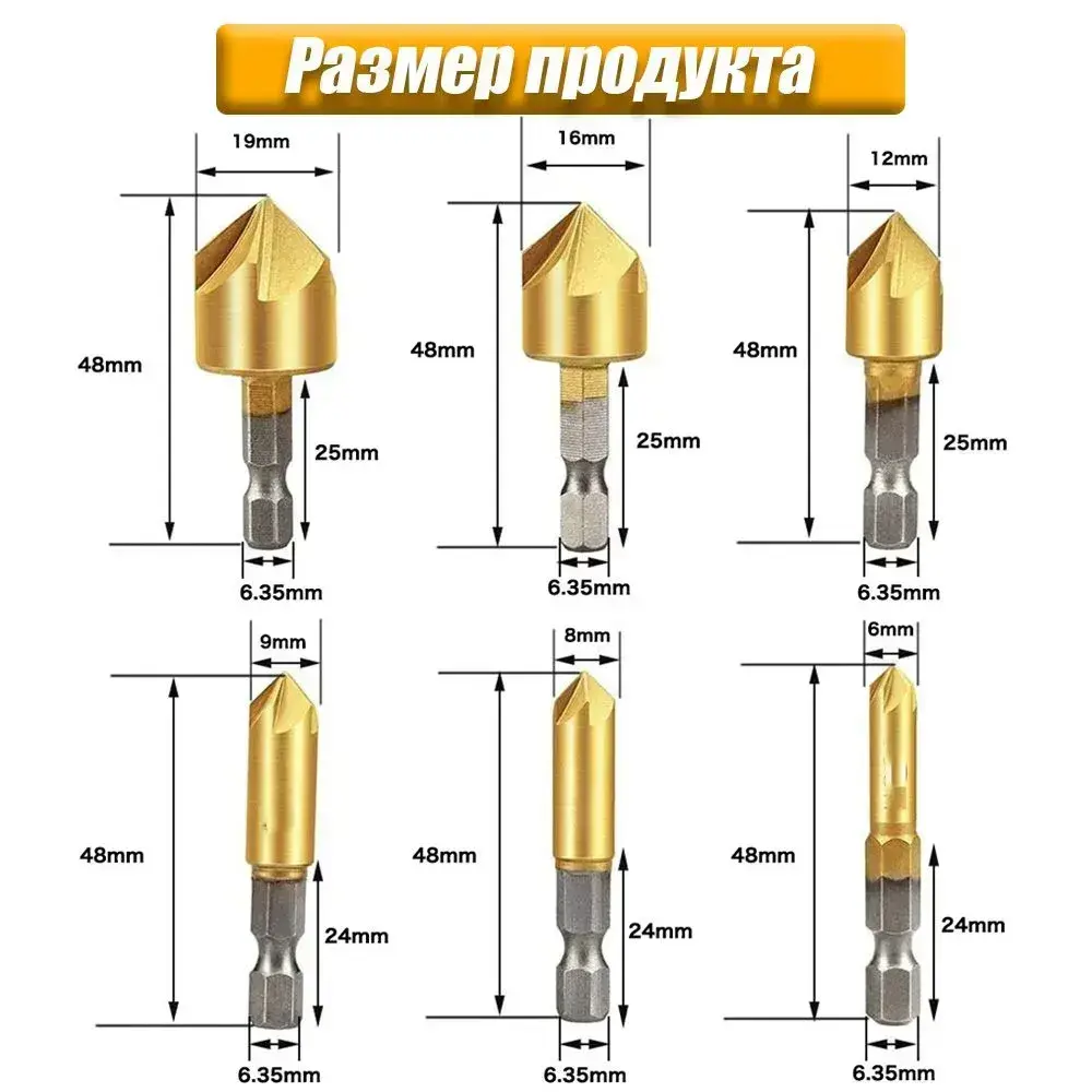 Набор зенкеров по металлу и дереву 6,8,9,12,16 и 19мм с титановым покрытием, в наборе - 6шт.