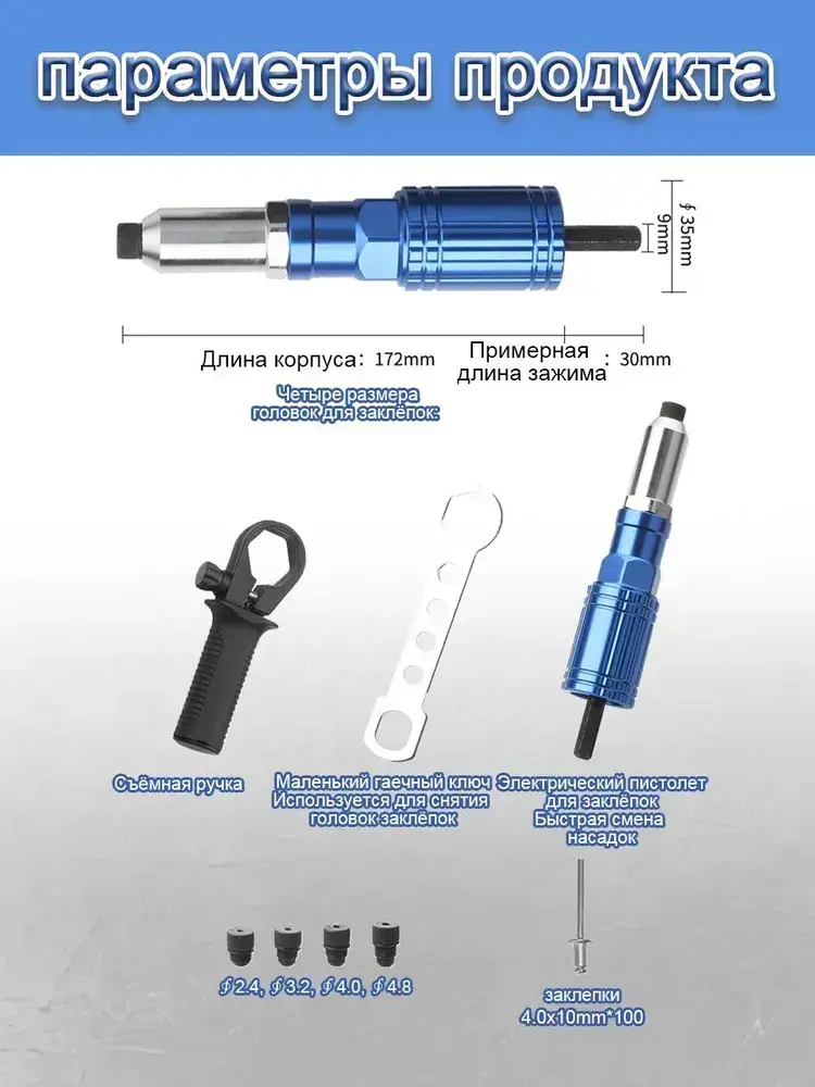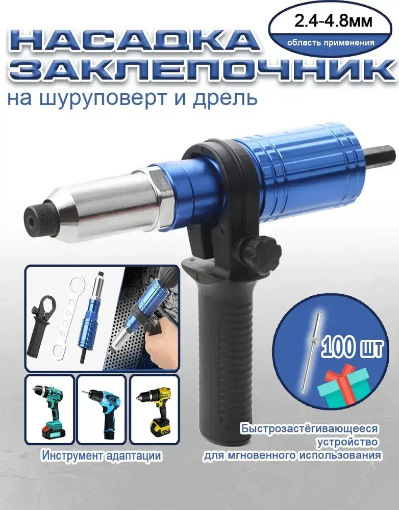 Насадка заклепочник на шуруповерт и дрель / Клепальник для заклепок 2,4-4,8 мм/С ручкой/со 100 заклепками