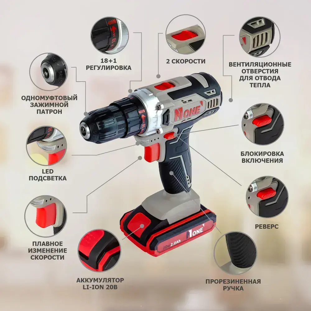 NUMBER ONE Дрель-шуруповерт, 20 В, 32 Нм, 2 АКБ