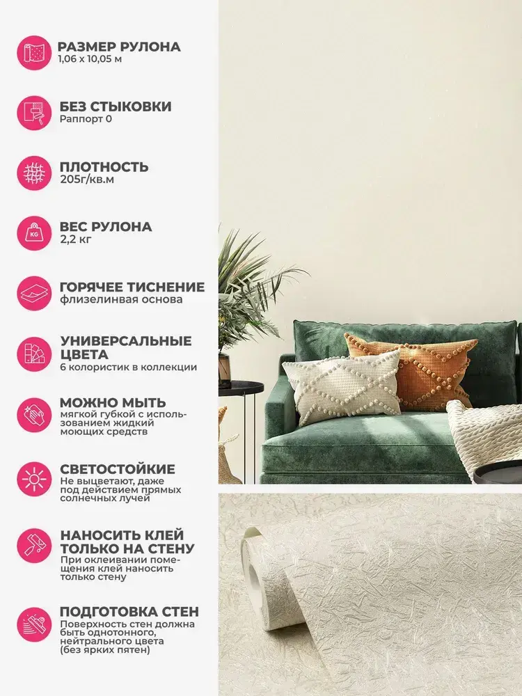 Обои флизелиновые 1.06. ASOZN-22, кремовый, глянцевые однотонные без подгона, для кухни, гостиной, коридора, спальни, детской