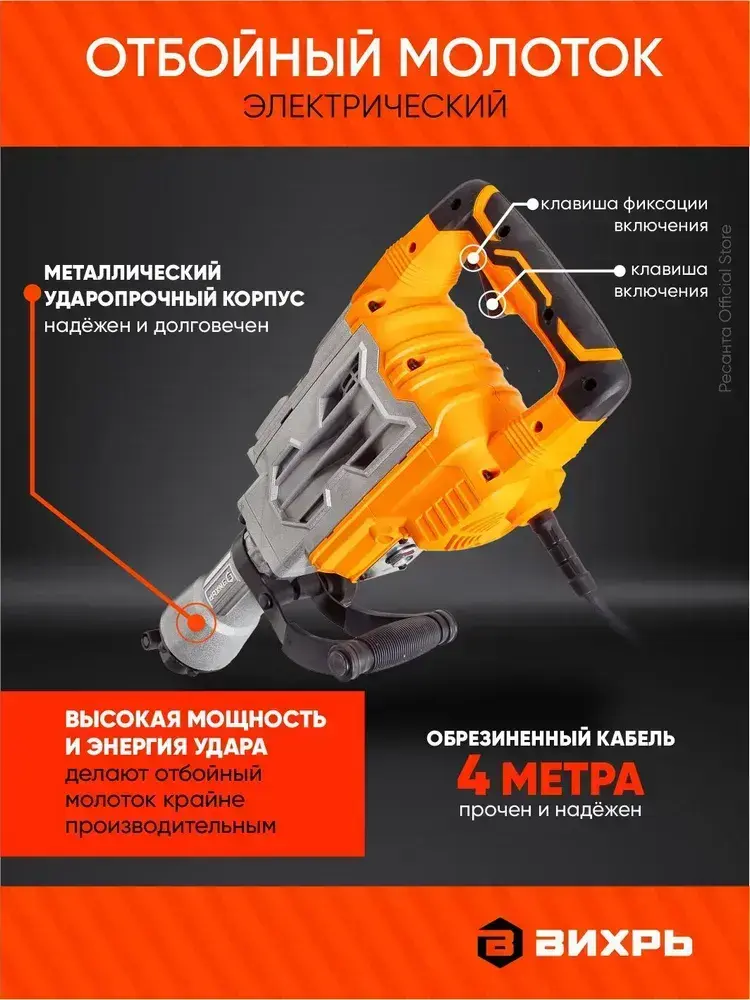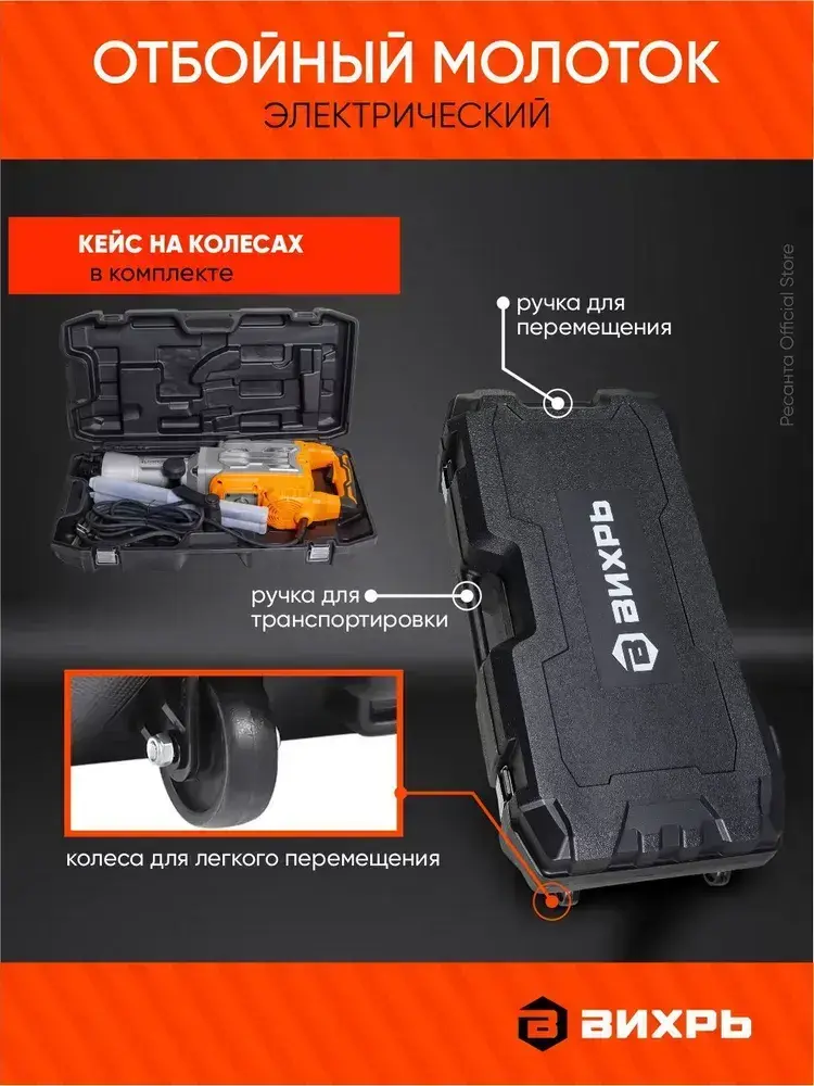 Отбойный молоток электрический ОМ-65А Вихрь - 1750 Вт, 2200 уд/мин, в кейсе на колесах, пика и долото в комплекте