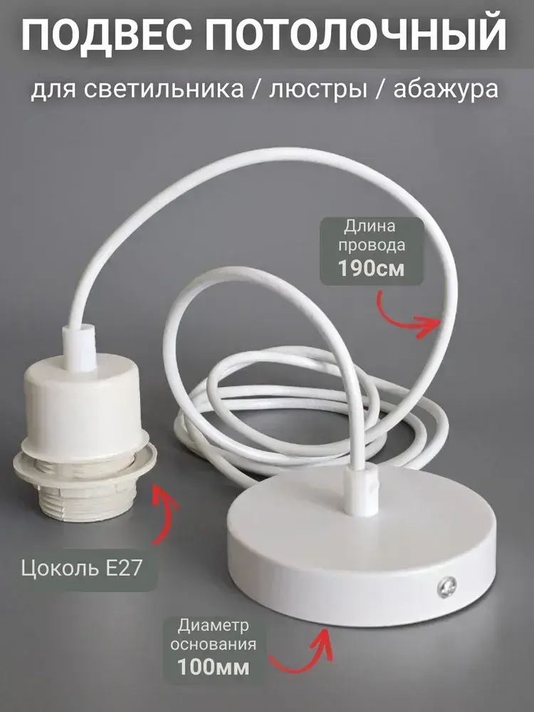 Патрон подвесной Е27 шнур подвес потолочный для светильника и люстры для лампы и абажура декоративный, белый, 1.9м, цоколь Е27, 60 Вт, 1 шт.