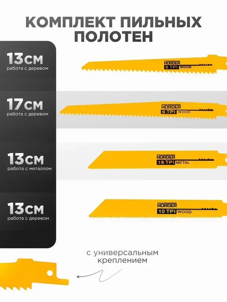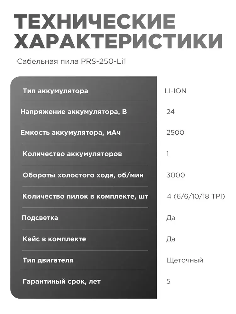 Пила сабельная аккумуляторная HORDER PRS-250 в кейсе 1 аккумулятор 24 В, 2.5 Ач, 3000 ход/мин 4 пильных полотна, подсветка, бесключевая замена пилки