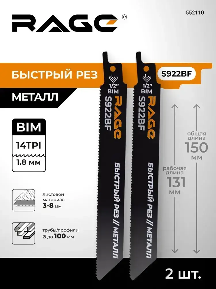 Пилка для сабельной пилы по металлу S922BF 150 мм шаг 1.8 мм 2 шт RAGE