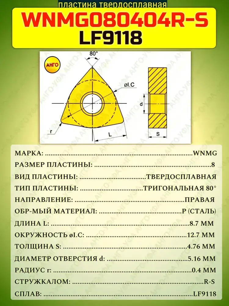 Пластина твердосплавная WNMG080404 R-S LF9118 10 штук Правая сменная по стали для резца MWLNR / L