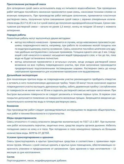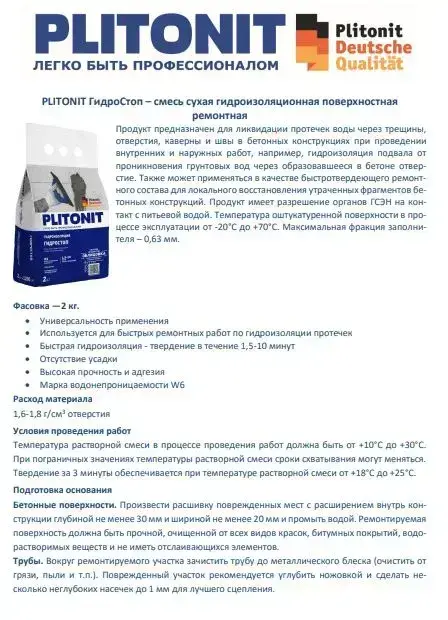 PLITONIT ГидроСтоп Быстротвердеющая смесь для ликвидации протечек 2 кг