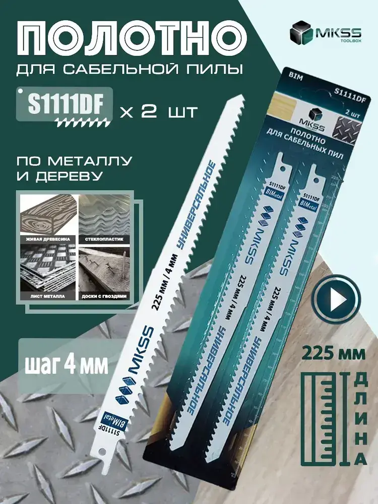 Полотно для сабельной пилы по дереву и металлу S1111DF, пилки для сабельной пилы 225 мм/4 мм, 2 штуки, S1111DF, MKSS