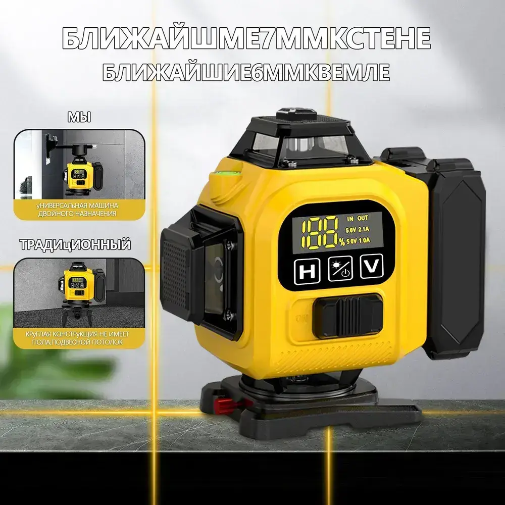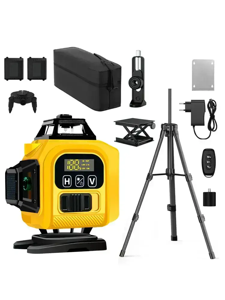 Профессиональный лазерный уровень 4D со штативом, зеленый луч дальность 50м, 16 лучей 360 градусов, самовыравнивание, кейс, пульт, откалиброван