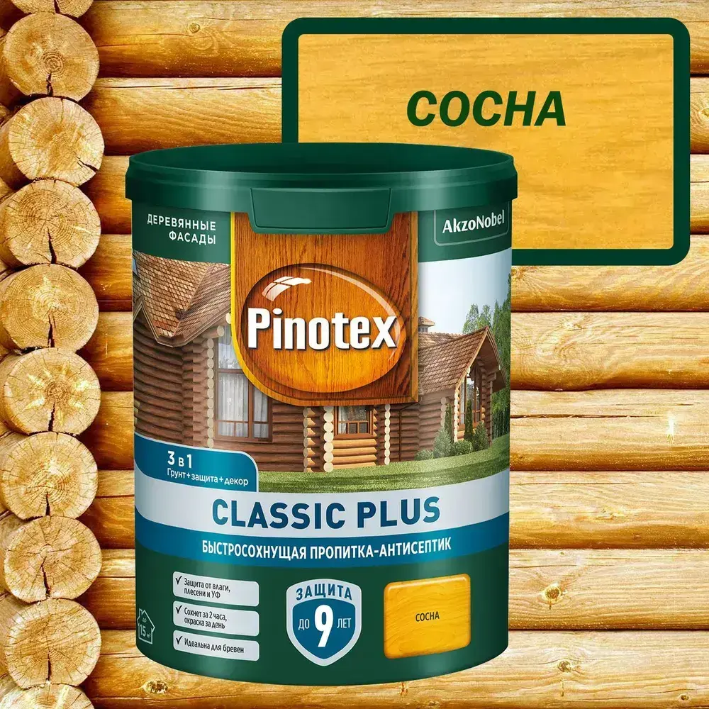 Пропитка декоративная для защиты древесины Pinotex Classic Plus 3 в 1 сосна 0,9 л.