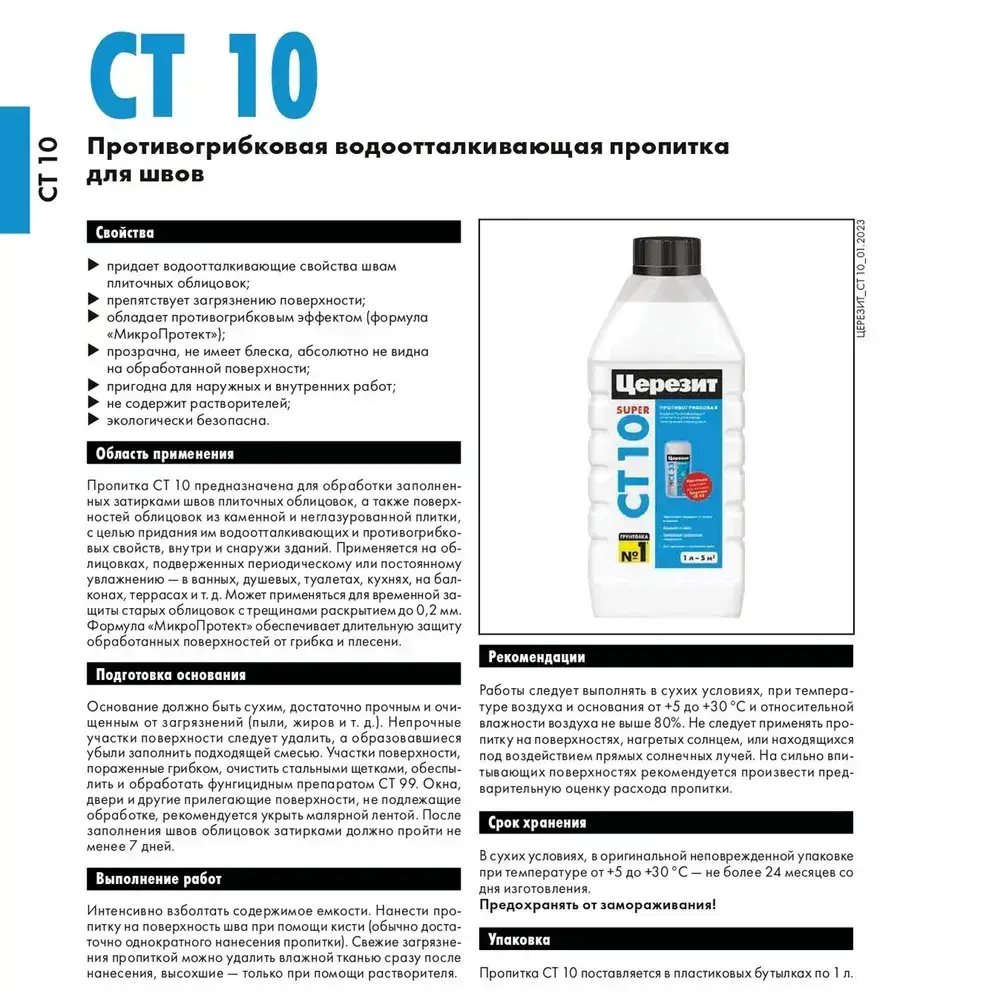 Пропитка противогрибковая водоотталкивающая пропитка для швов ЦЕРЕЗИТ СТ 10 1 л