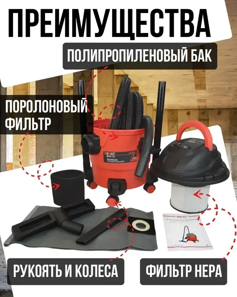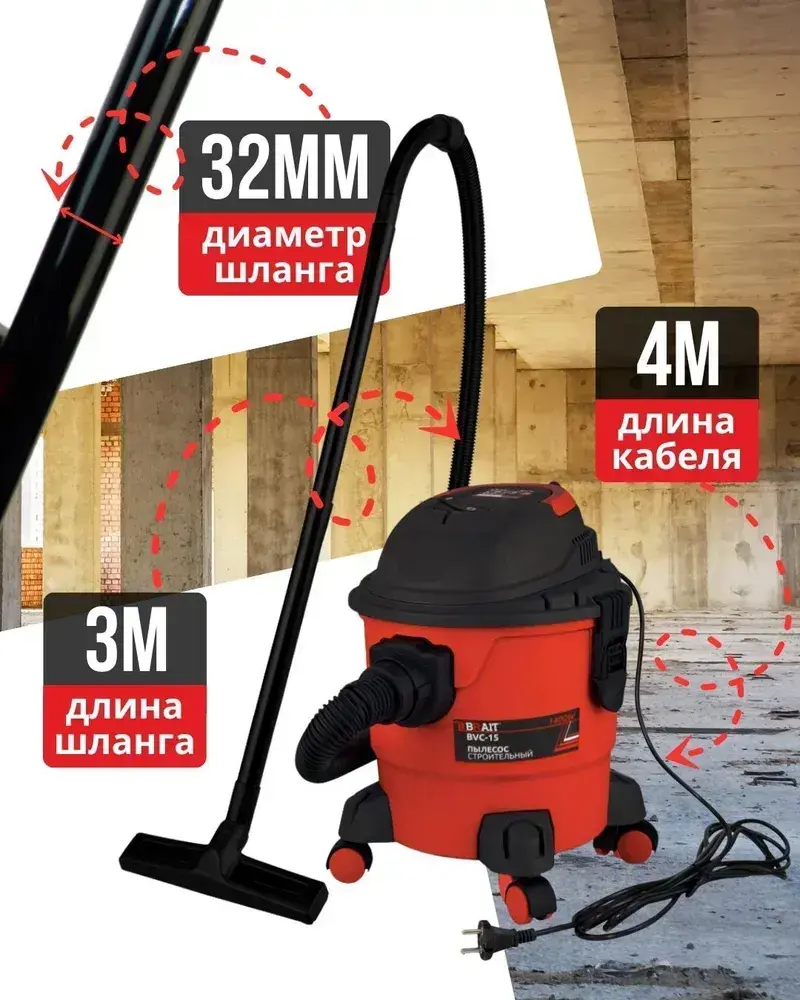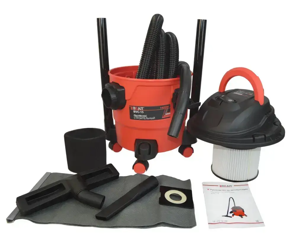 Пылесос строительный BVC-15 ( 230 В, 1400Вт, пылесборник 15 л., шланг 3 м) / для уборки помещений / для строительного мусора