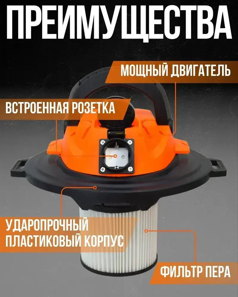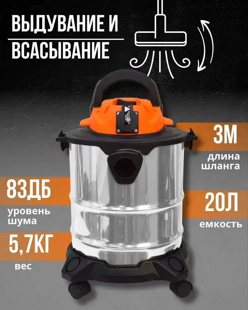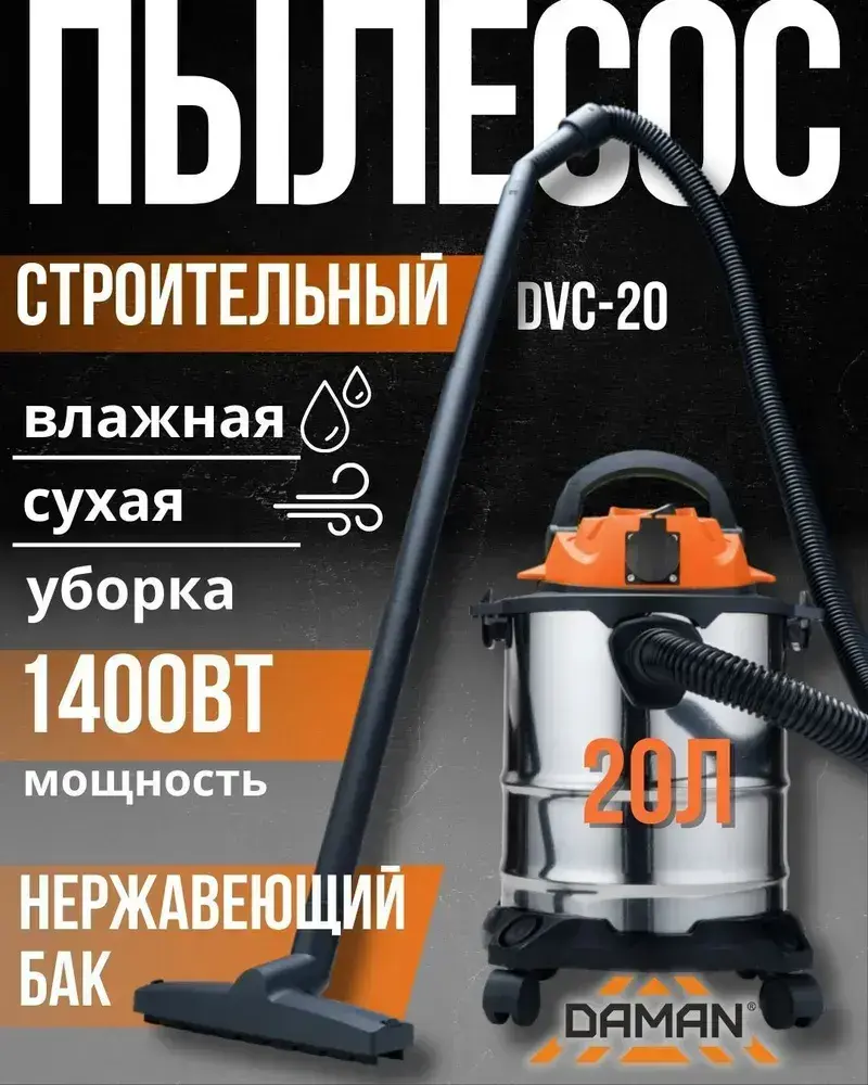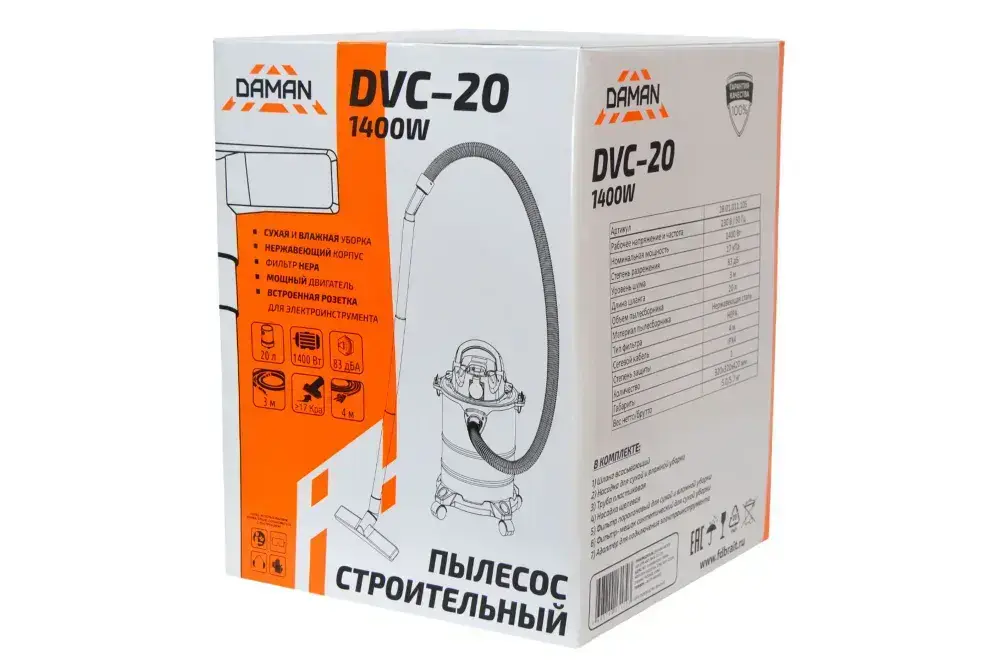 Пылесос строительный DVC-20 (DAMAN,230В,50Гц,1400Вт, пылесборник 20л, нерж.сталь, шланг 3м)